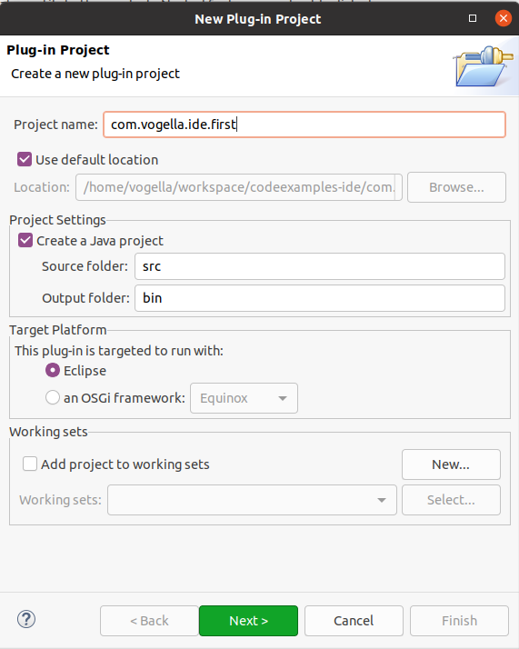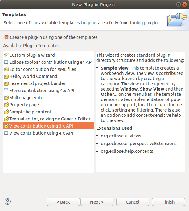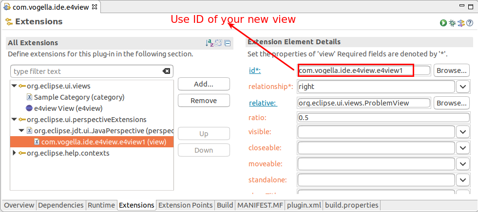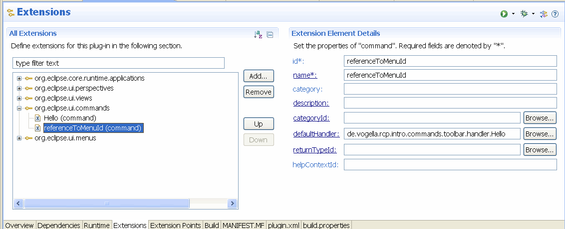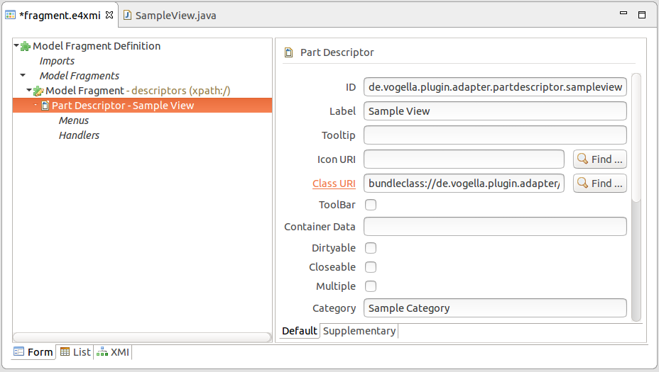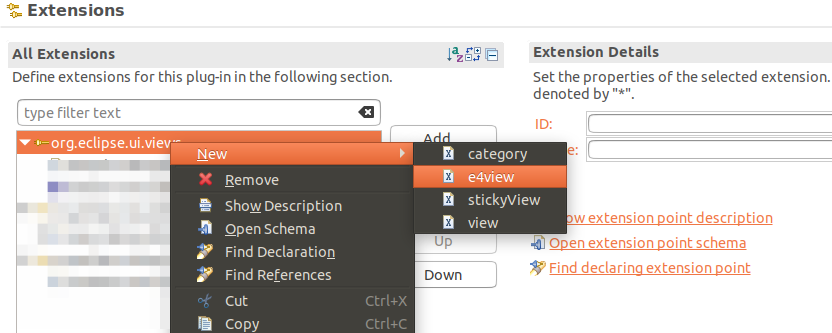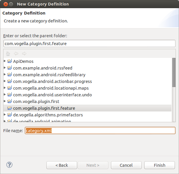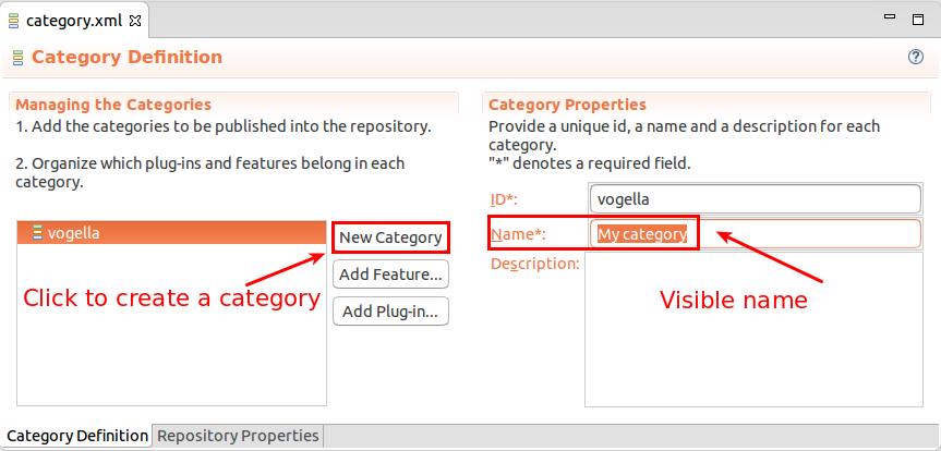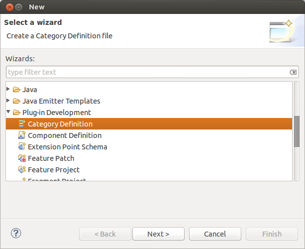 feature 프로젝트 내에File >New >Other… >Plug-in development >Category Definition를 메뉴 엔트리를 통해 새 카테고리 정의를 생성할 수 있다.