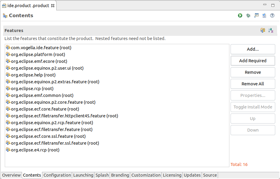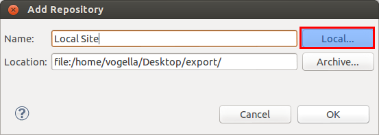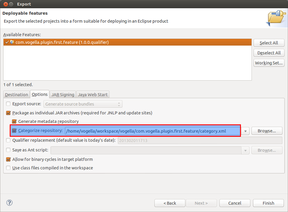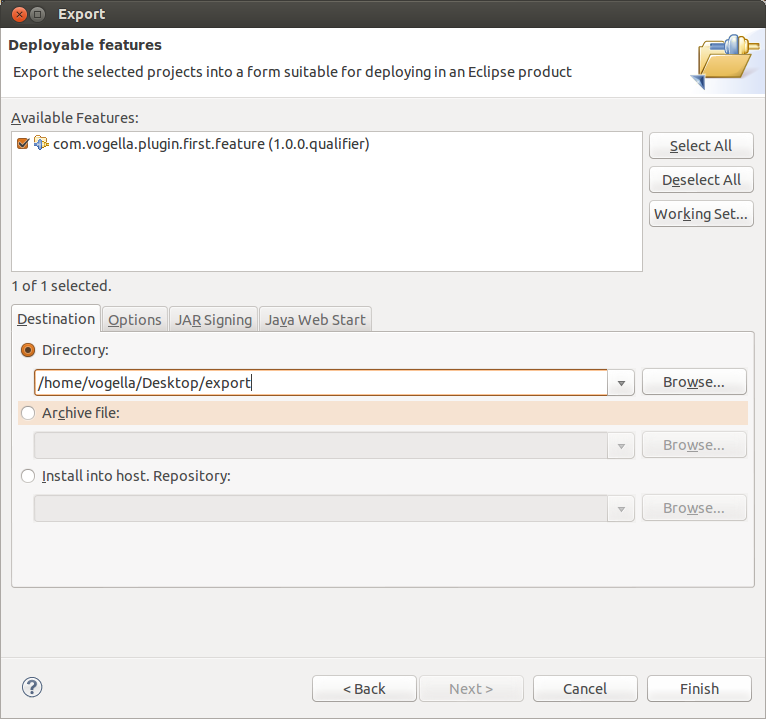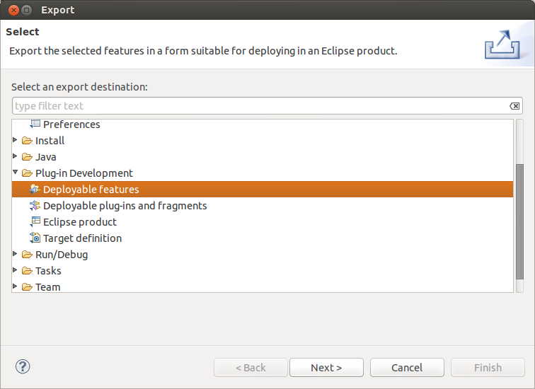 장비에 로컬 디렉토리에 feature를 위한 업데이트 사이트를 생성 할 수 있다. 그러기 위해, File >Export >Deployable features를 선택한다.