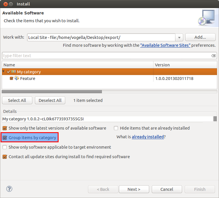 로컬 디렉렉토리를 지정해서 업데이트 관리자를 사용하라. 그리고 feature를 선택하고 설치 하라. feature를 볼수 없을 경우에, 카테고리 플래그로 항목( Group items by category)을 선택 취소를 시도하라. 이렇게 하면, 내보내기 하는 동안 카테고리를 설정하는 것을 잃어버리게 된다.