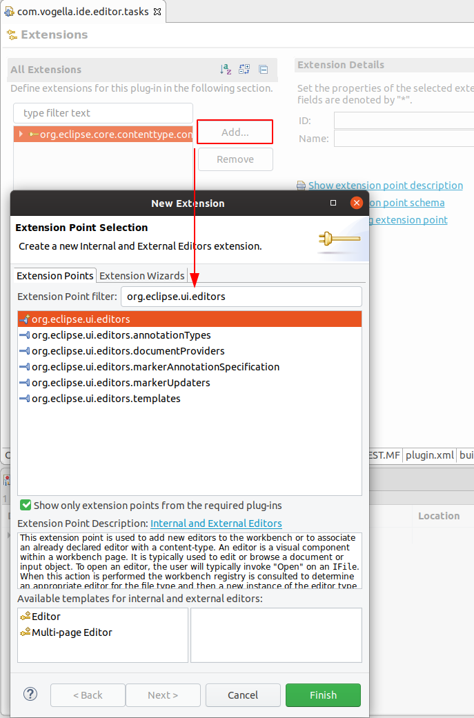 이클립스 IDE를 위한 새 에디터를 정의 하기 위해, 전형적으로, * IEditorInput 클래스를 생성한다. * "org.eclipse.ui.editors" 확장점(extension point)을 위한 확장을 정의한다. * IEditorPart를 확장한 클래스를 구현한다.