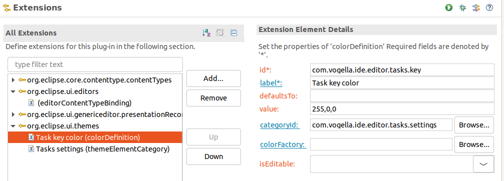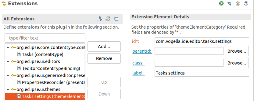 이 페이지를 위한 엔트리를 정의하기 위해, "org.eclipse.ui.themes" 확장점(extension point)을 위한 확장점을 정의할 필요가 있다.