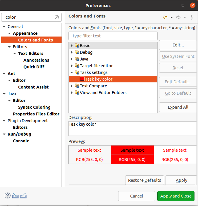 이클립스는 General > Appearance > Colors and Fonts에서 사용자에 의해서 색상과 폰트를 사용자 정의 하기 위한 페이지를 제공한다.