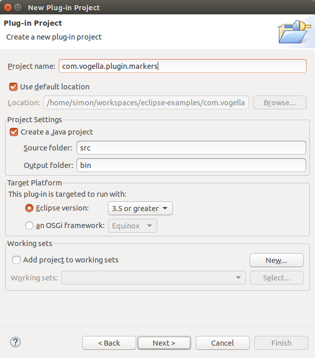 "com.vogella.ide.editor.tasks"로 불리는 간단한 새 플러그인 프로젝트를 생성한다.